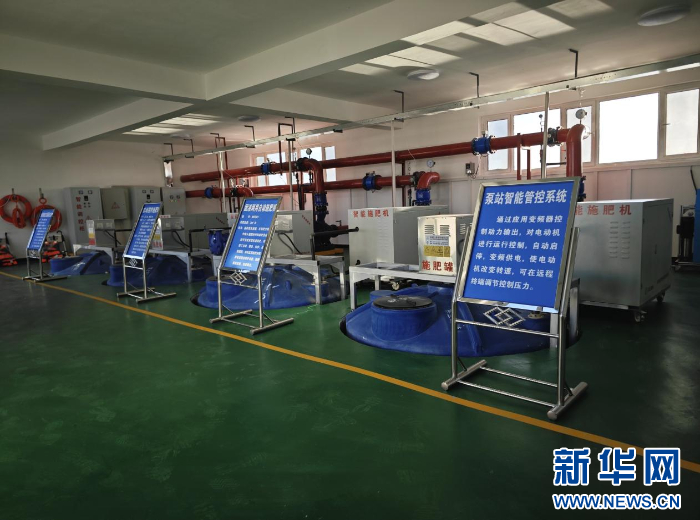 玉门市黄闸湾镇万亩水肥一体化高标准农田示范点的自动化设施。新华网发(童张伟 摄)