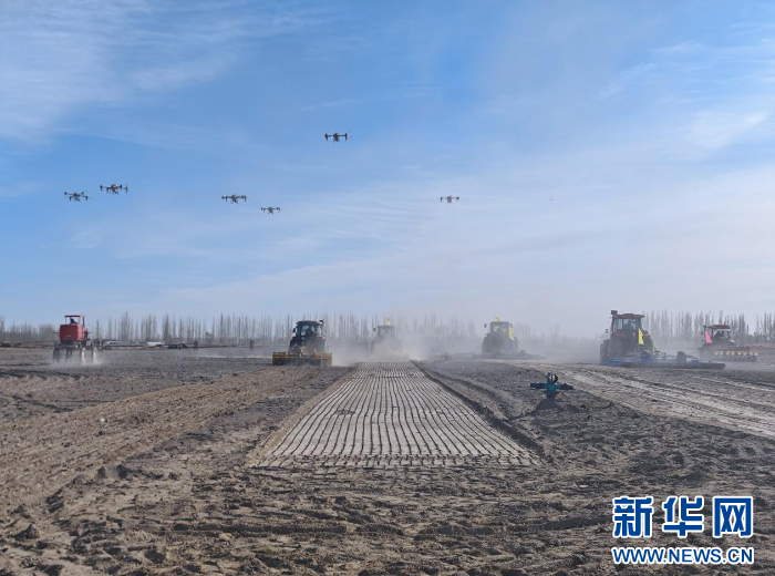 玉门市粮食产能提升万亩高标准农田建设示范点上展示的现代化农业装备。新华网发(童张伟 摄)