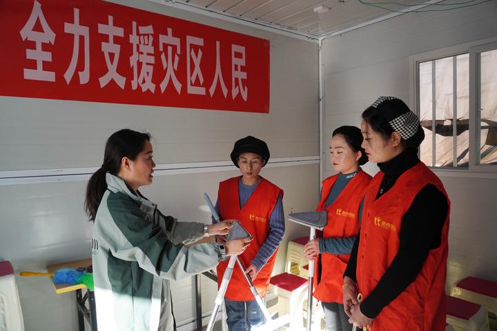 1月16日,在甘肃省临夏州积石山县大河家镇陈家村安置点,群众参加保洁技能培训班。新华社记者 马希平 摄