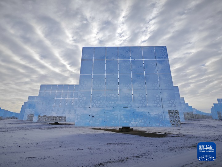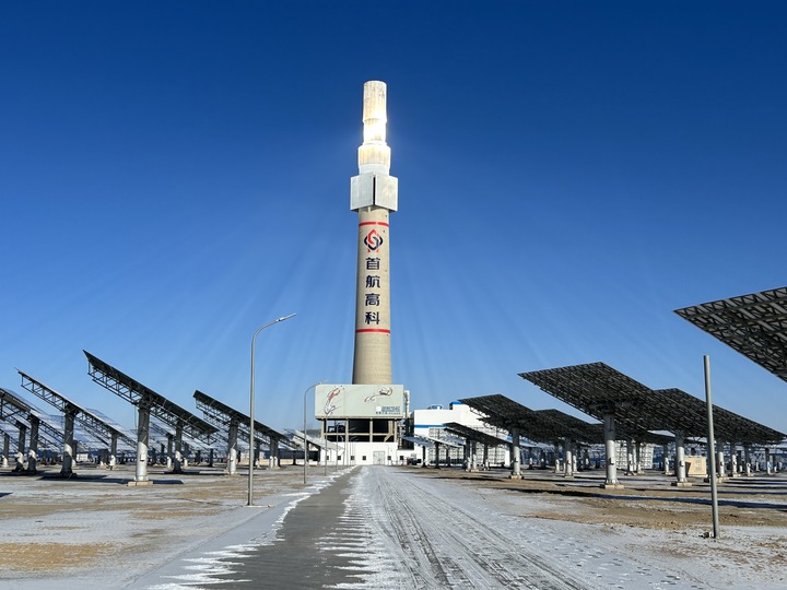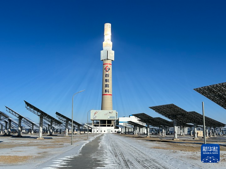 1月25日,甘肃省首航敦煌熔盐塔式光热电站的吸热塔在戈壁滩上闪耀。新华社记者 袁全 摄