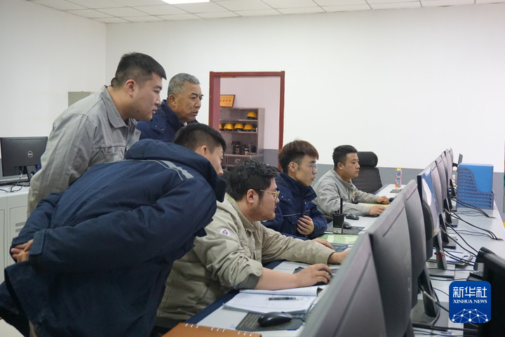 1月25日,刘福国(后左二)在甘肃省首航敦煌熔盐塔式光热发电站项目一期集控室与值班人员一起查看运行情况。新华社记者 贾钊 摄