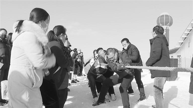 游客在雪地中拔河。