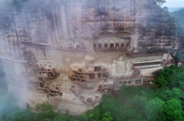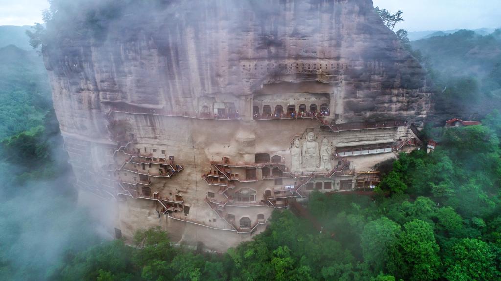 这是2023年5月31日在甘肃省天水市拍摄的烟雨笼罩下的麦积山石窟(无人机照片)。新华社记者 郎兵兵 摄