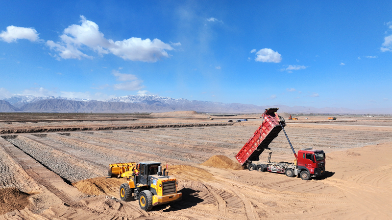 3月27日,甘肃省张掖市甘州区现代设施农业产业园里,大型机械、车辆正在开挖沟垄、换填熟土、平整土地,加快建设现代设施农业集群。