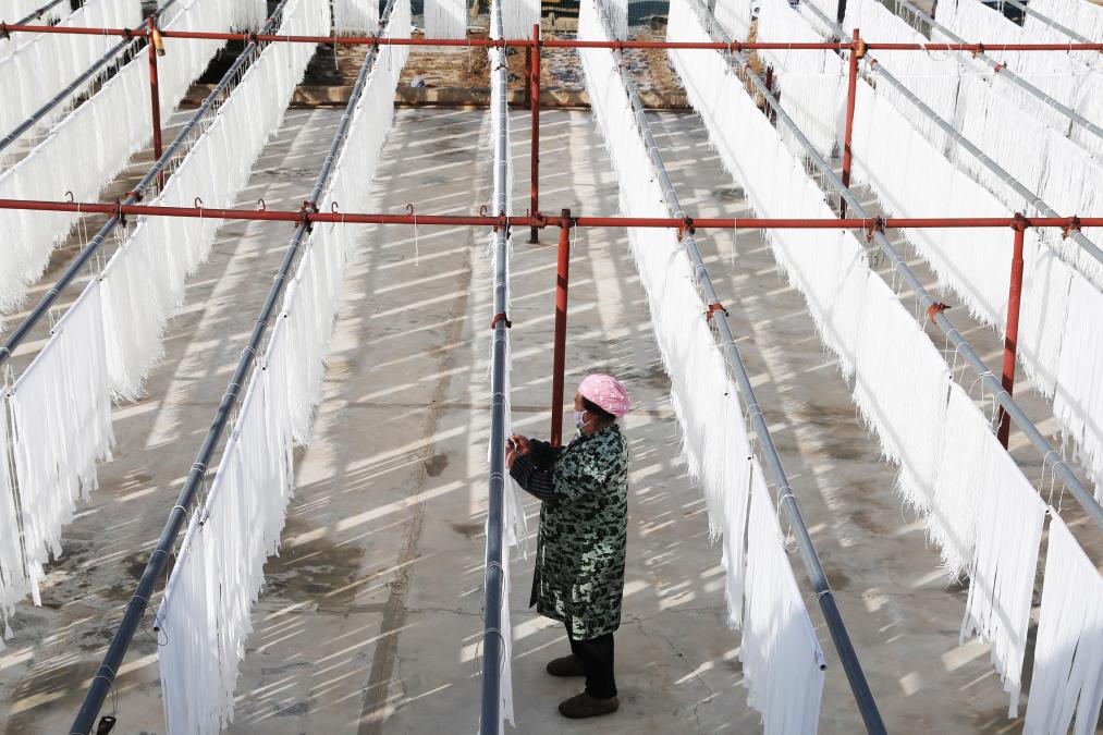 3月27日,工人在甘肃省定西市安定区凤翔镇的一家“定西宽粉”加工企业晾晒宽粉。