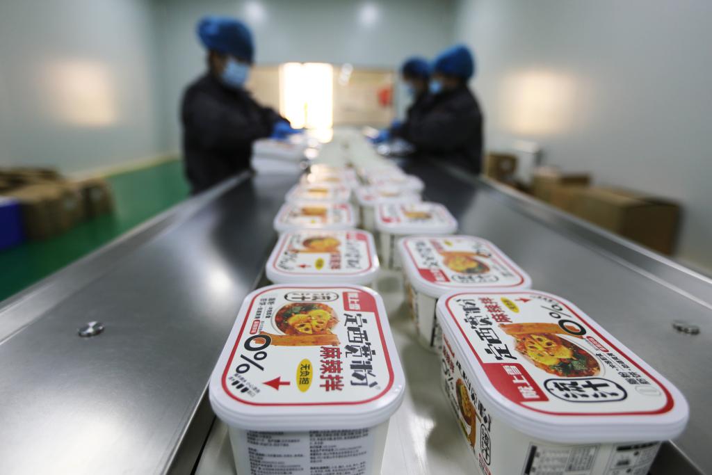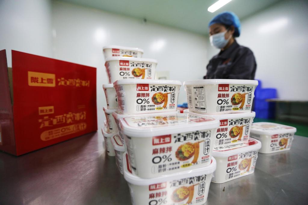 3月27日,工人在甘肃省定西市安定区巉口镇的一家“定西宽粉”加工企业的生产车间内包装“定西宽粉”系列产品。