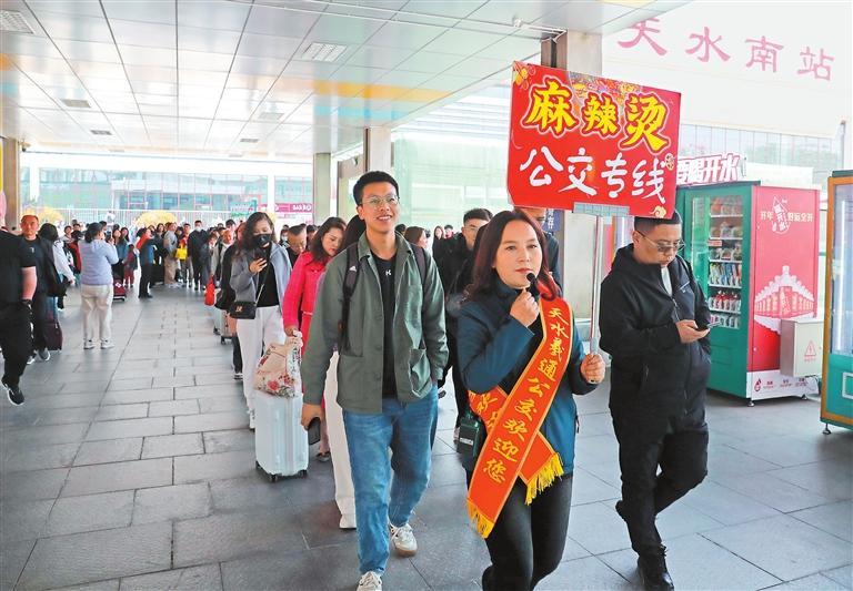 在天水南站出站口平台,工作人员引导游客乘坐“麻辣烫公交专线”。
