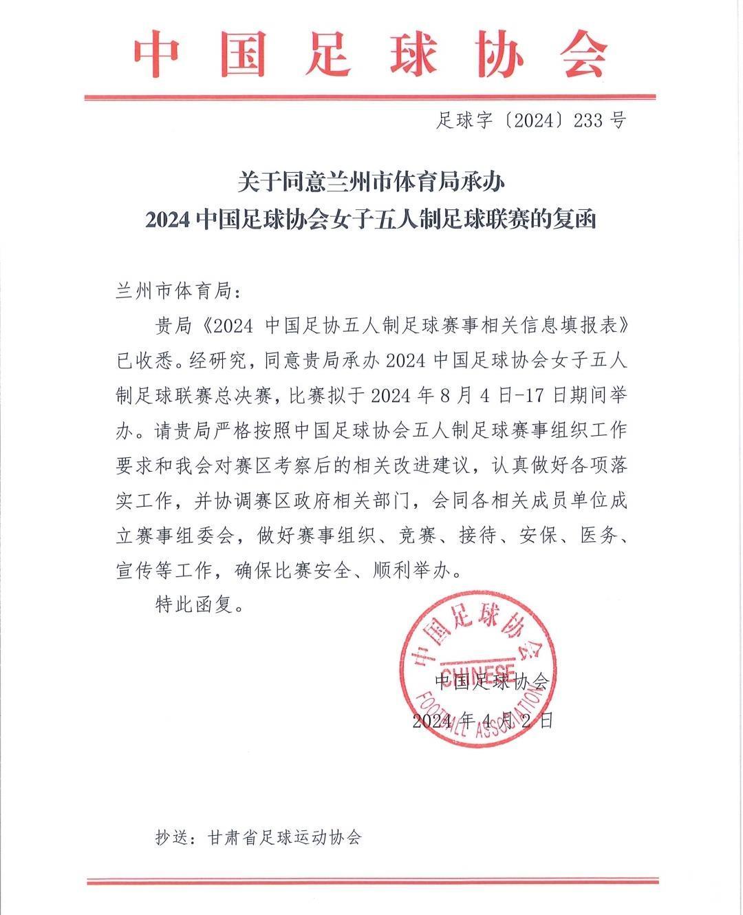 进入新赛季,兰州市体育局再度积极申办这一赛事,经研究,中国足协正式复函,同意兰州市体育局承办2024 中国足球协会女子五人制足球联赛总决赛,并请兰州市体育局严格按照相关赛事组织工作要求及改进建议,认真做好各项落实工作;协调赛区政府相关部门,会同各相关成员单位成立赛事组委会,做好赛事组织、竞赛、接待、安保、医务、宣传等工作,确保比赛安全、顺利举办。