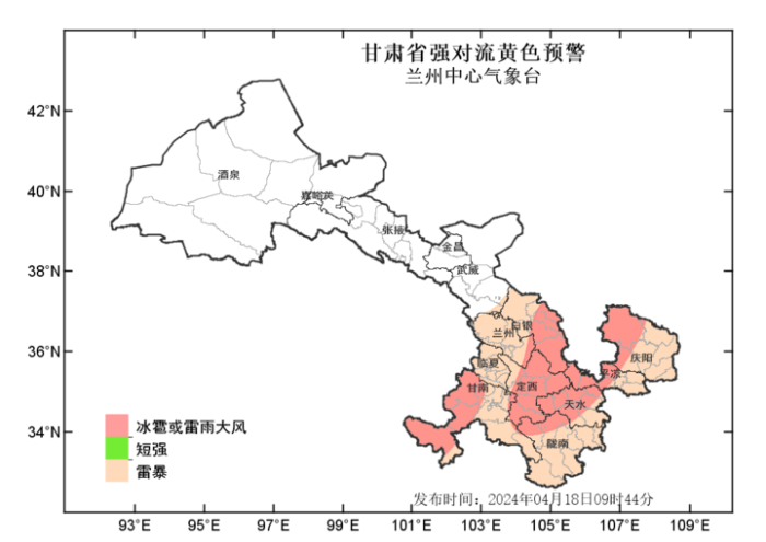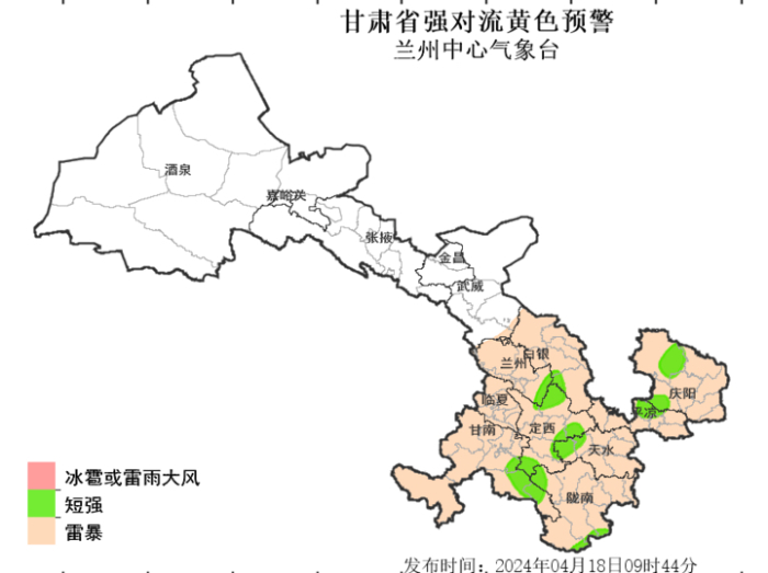 兰州中心气象台预计,4月18日白天到夜间,武威以东大部分地方有雷暴天气,其中,兰州、白银、定西、天水、陇南等地部分地方有雷雨大风或冰雹天气;甘南州、陇南、定西、天水等局部地方有短时强降水,最大小时雨强为20毫米至30毫米。白银、兰州等地先后发布气象预警。