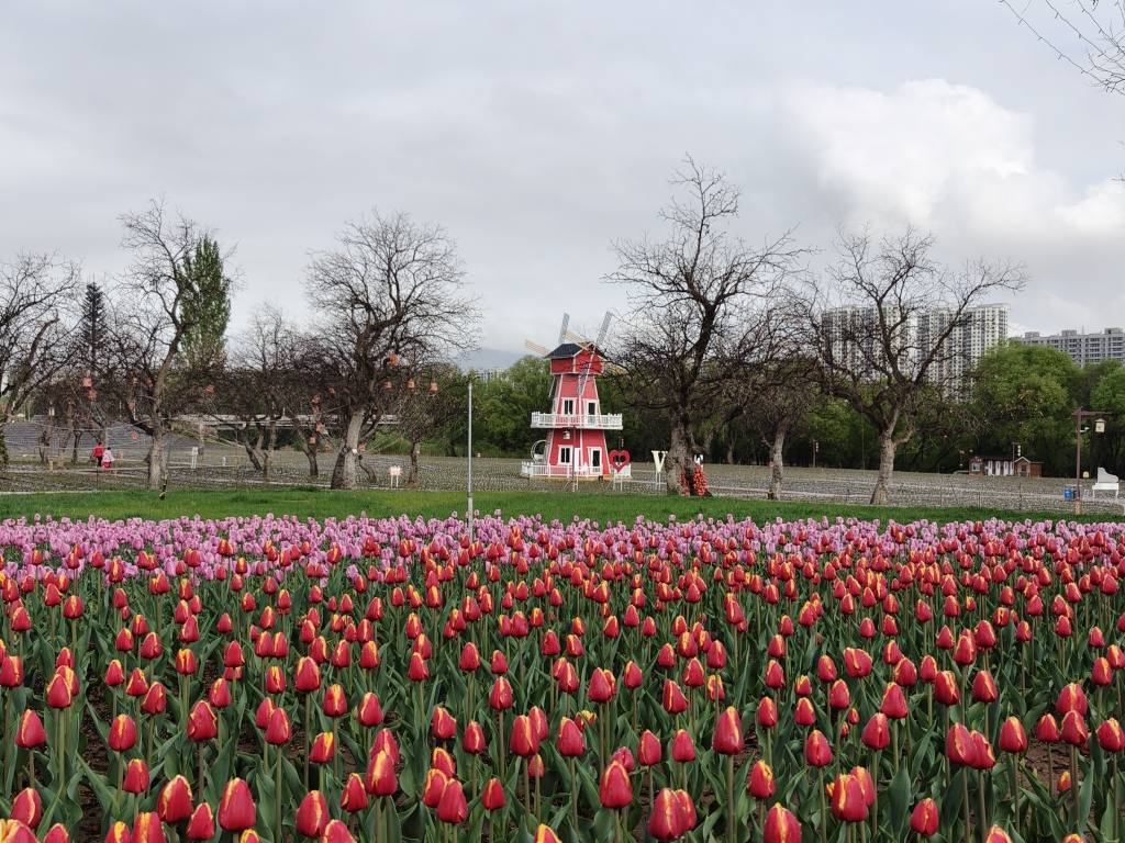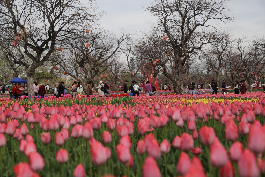 近期,在位于甘肃省临夏回族自治州永靖县的黄河花堤郁金香公园里,花团锦簇,游人如织。公园内种植的郁金香正处于盛花期,各种颜色的郁金香在阳光下绚丽绽放,形成了一片五彩斑斓的花海,令人陶醉,吸引了众多游客前来打卡。(杨慕冉)