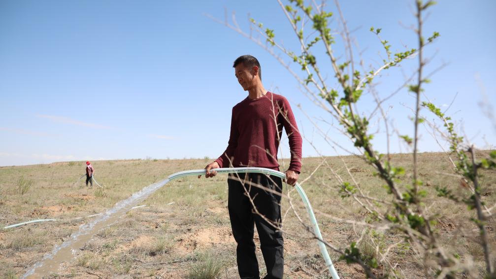 郭玺在八步沙林场内给树苗浇水。新华社记者 张睿 摄