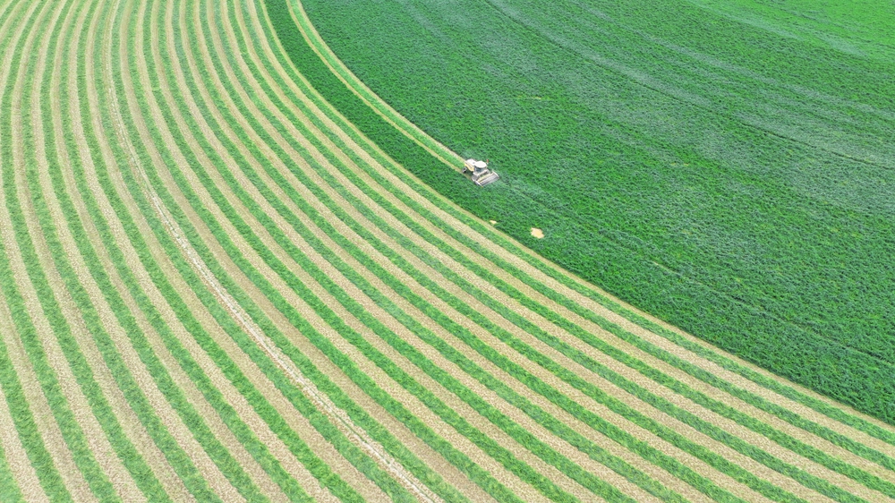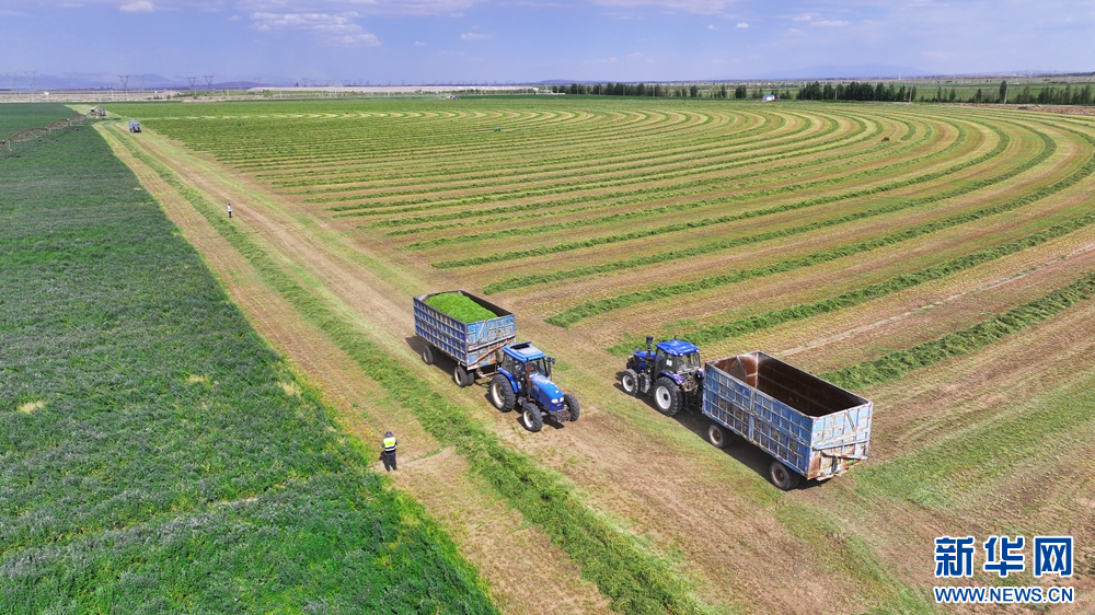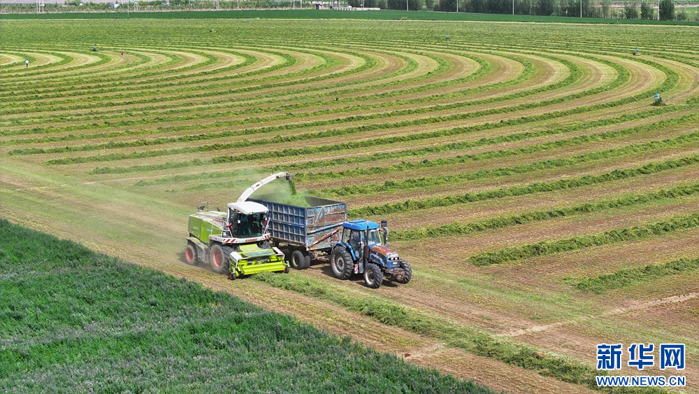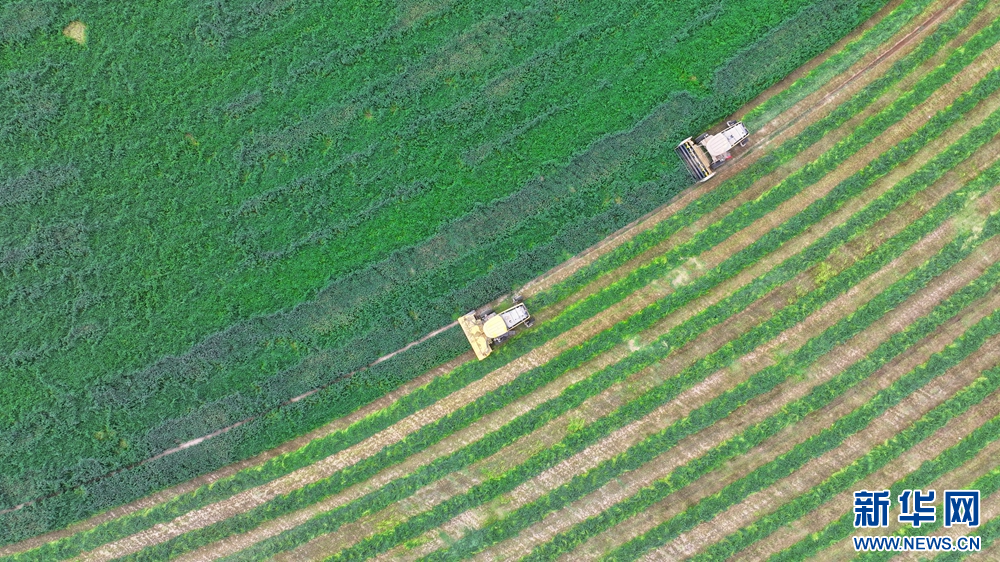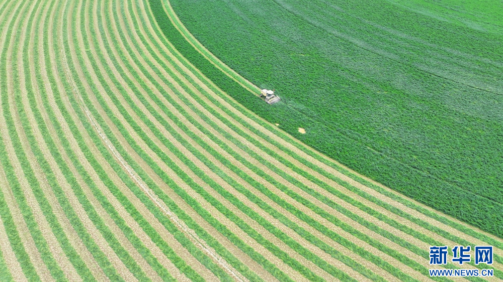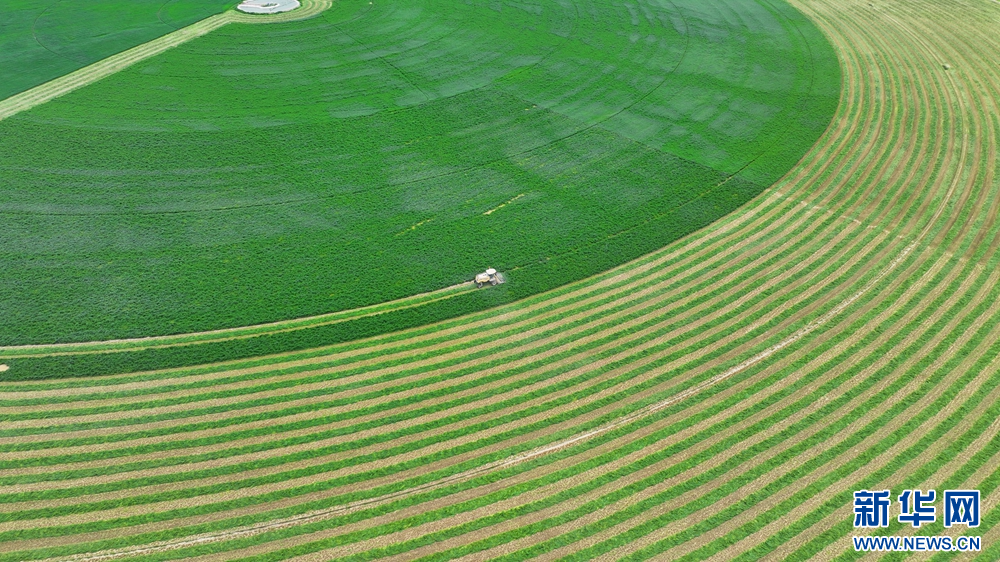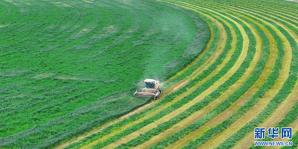 夏日里,甘肃省张掖市民乐工业园区内的8000亩紫花苜蓿进入头茬收割期,工人驾驶收割机收割头茬紫花苜蓿,收割后的紫花苜蓿从缀满紫花的“绿绒毯”变成了巷道分明的“条纹毯”。新华网发(王晓泾 摄)