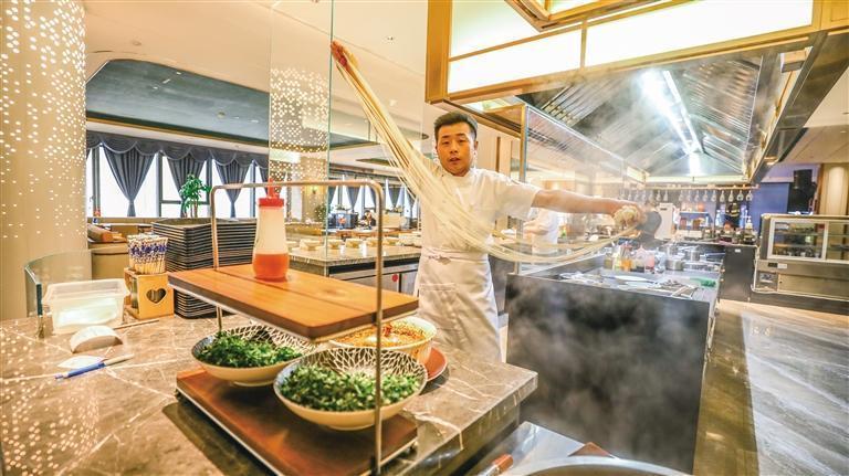 观金城精品牛肉面店的拉面师傅展示拉面技艺。兰州日报社全媒体记者 胡淼山 摄