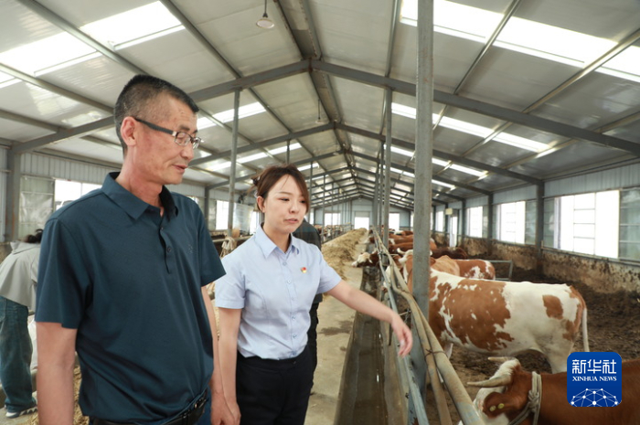 中国邮政储蓄银行平凉市分行工作人员在平凉市崆峒区寨河乡鄢铺村调研牛产业。(新华社记者 王铭禹 摄)
