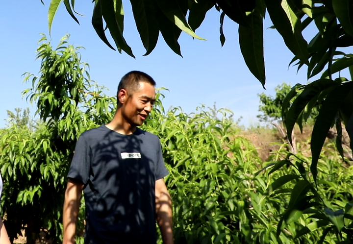 贾竣正在桃园观察桃子的长势。(新华社记者王铭禹 摄)
