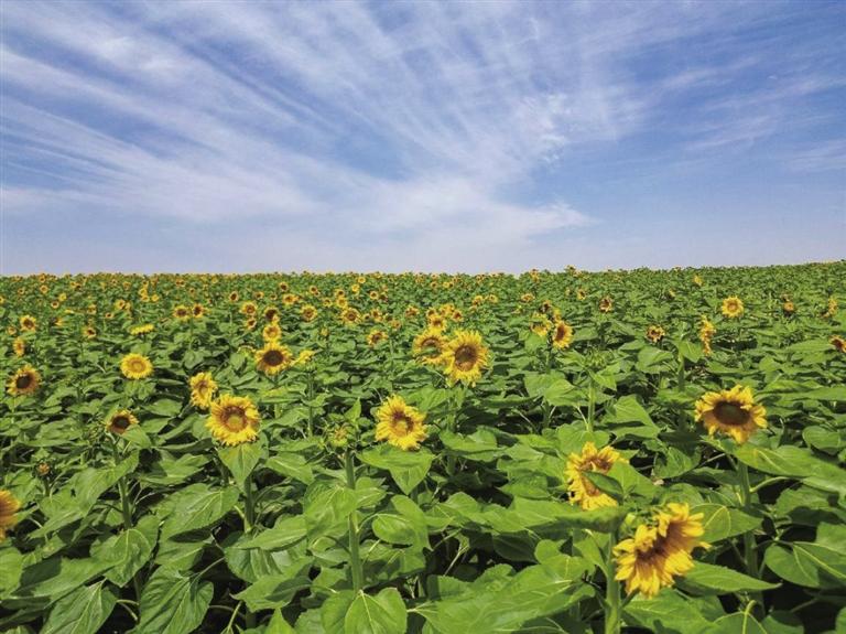 食葵日常管理方便、生长周期短、产出效益好,花期一直从7月初持续到8月底,具有很高的观赏价值和食用价值,成片种植,开花时金黄耀眼,极为壮观。清风拂过,灿烂的金色花海与蓝天白云交相辉映,鲜嫩的绿、璀璨的黄,金色花海、蓝天白云,满目的生生不息,宛若一幅多彩浪漫的油画。