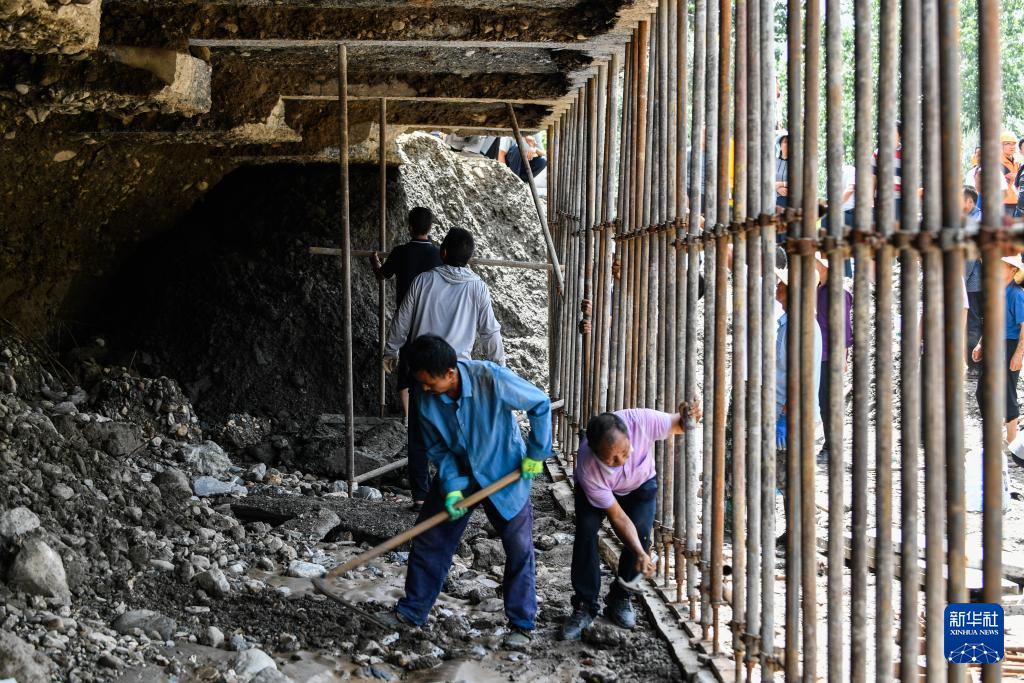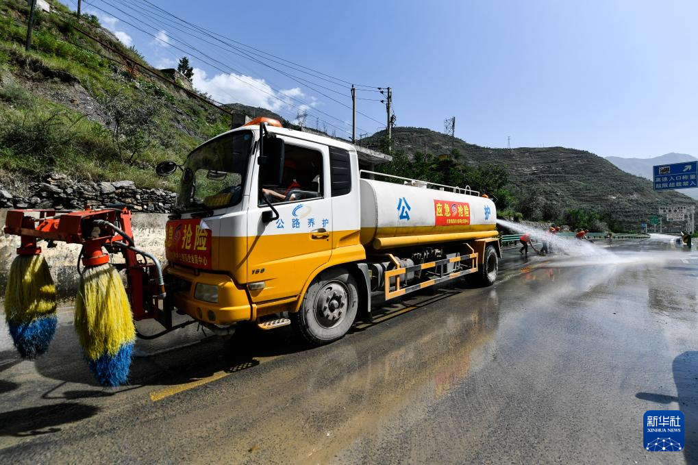 7月25日,在甘肃省陇南市武都区外纳镇宗家坝村,武都公路段养护职工在国道212线清洗水毁路面。新华社记者 郎兵兵 摄