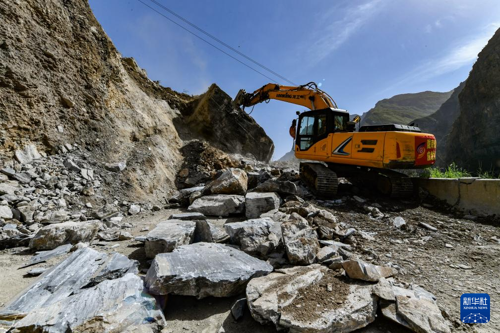 7月25日,在甘肃省陇南市武都区外纳镇,武都公路段养护职工操作机械清理国道212线九姊妹梁段塌方体。新华社记者 郎兵兵 摄
