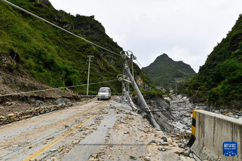 7月26日,在前往武都区三河镇姚沟村三社途中拍摄的一处被山洪、泥石流摧毁的供电线路。新华社记者 郎兵兵 摄