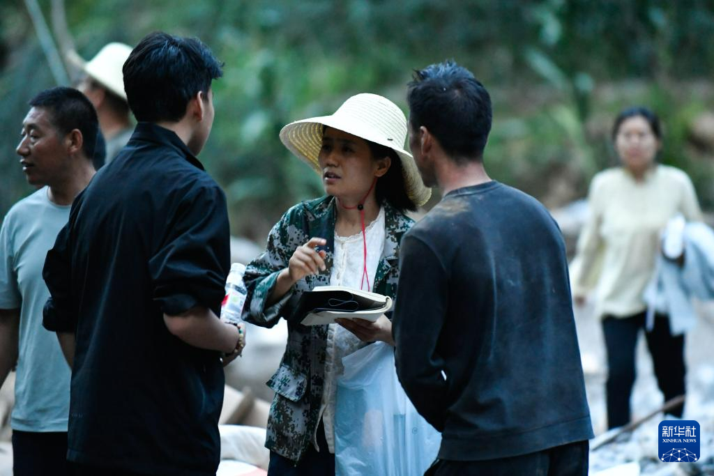 7月26日,救援人员介绍挺进姚沟村三社情况。新华社记者 郎兵兵 摄