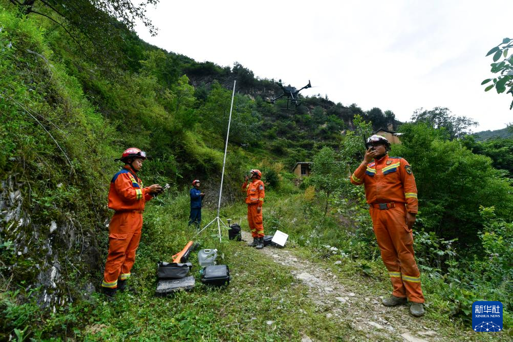 7月26日,在陇南市武都区三河镇姚沟村三社,救援人员利用无人机和基站建立应急通讯系统。新华社记者 郎兵兵 摄