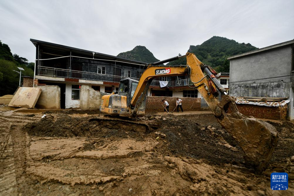 7月28日,在陇南市武都区黄坪镇成坝村,当地抢险救援人员在操作机械清理淤泥。新华社记者 郎兵兵 摄