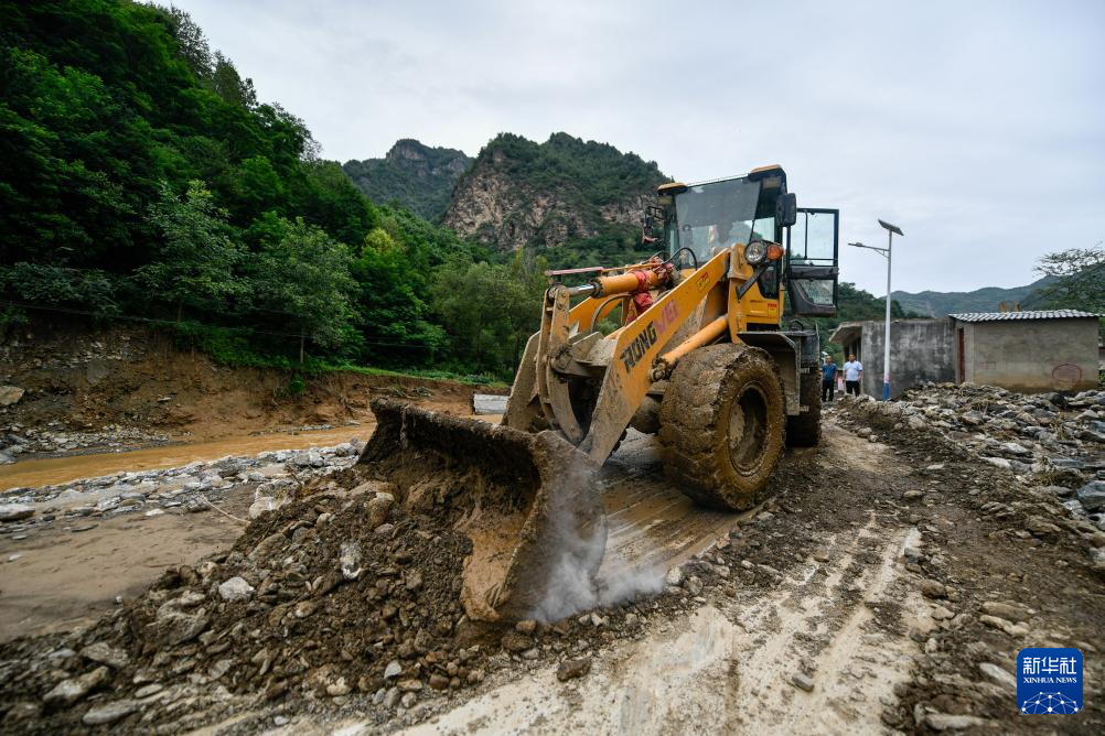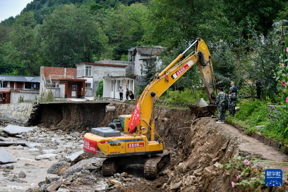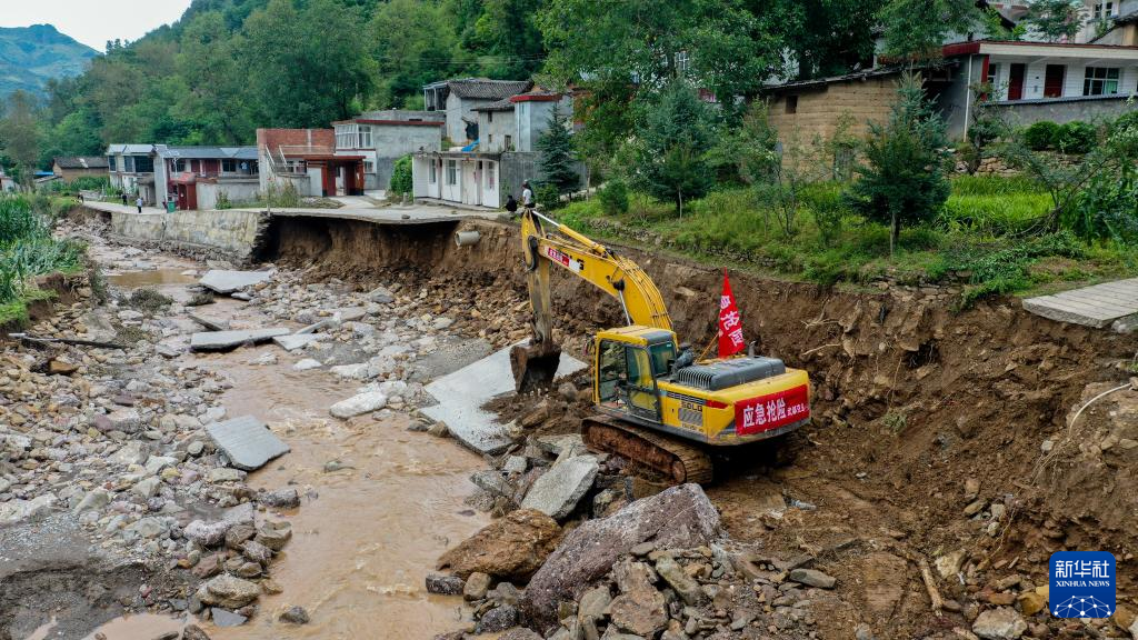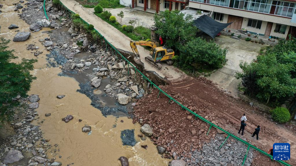 7月28日,在陇南市武都区黄坪镇楼房坝村,当地抢险救援人员在抢修受损农村公路。新华社记者 郎兵兵 摄