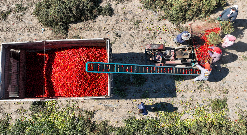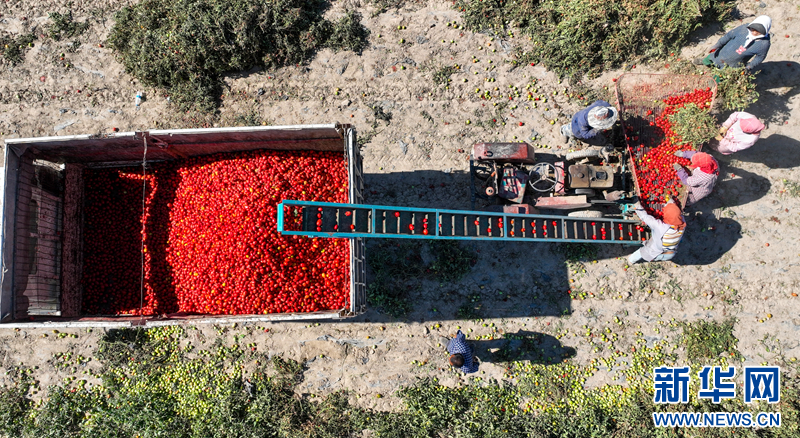 工人采收番茄。新华网发(曹红祖 摄)
