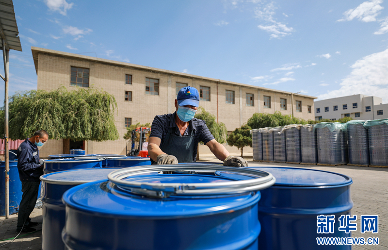 8月27日,工人将生产好的番茄酱封盖。新华网发(裴海洋 摄)