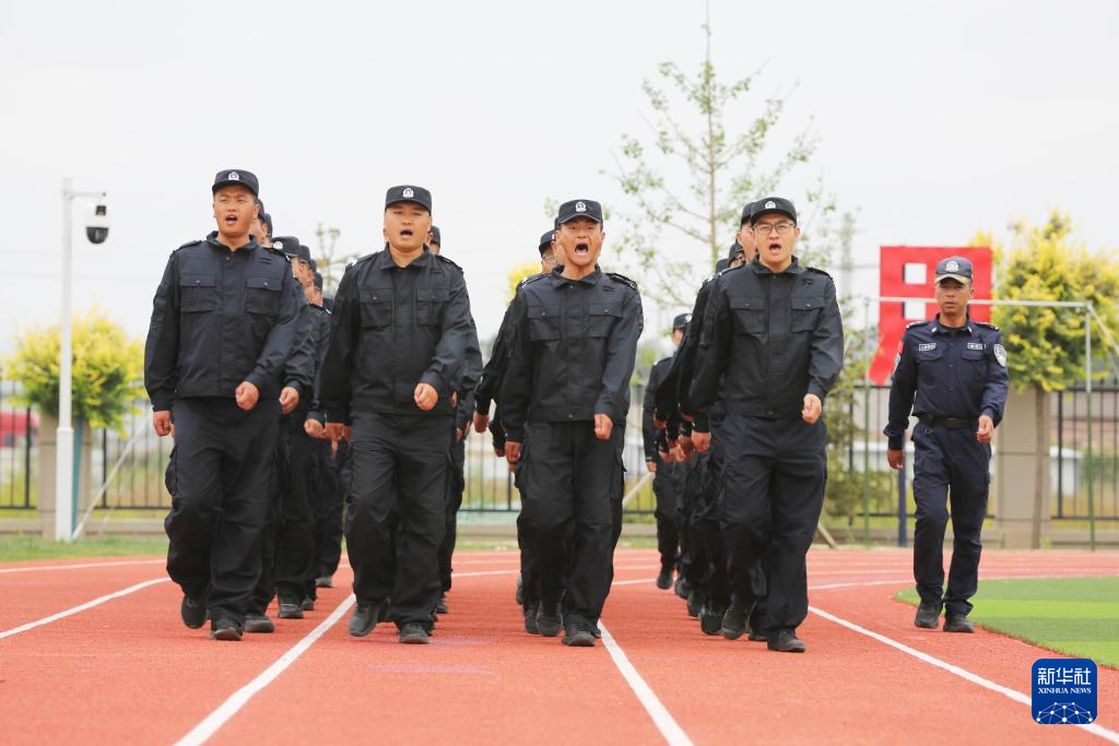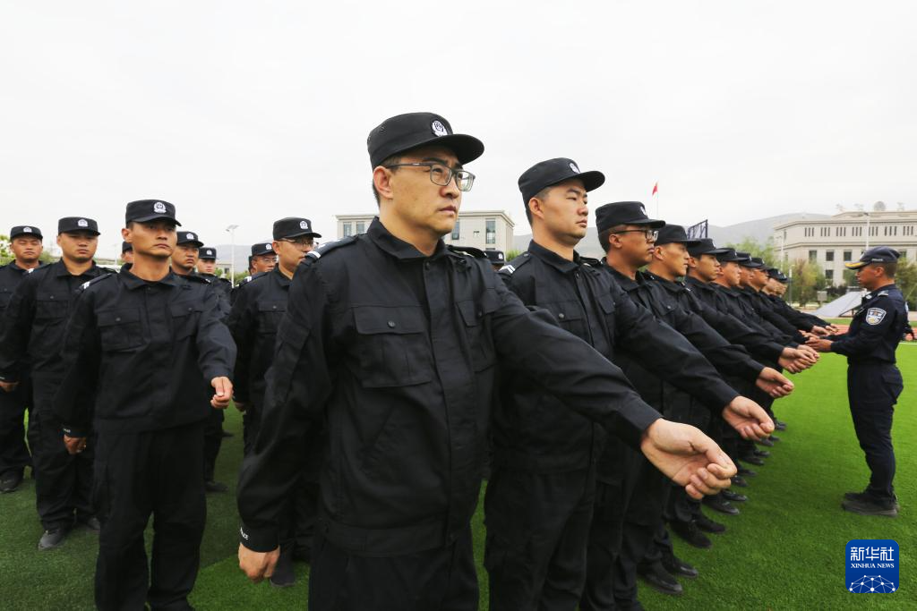 8月28日,李建国(前排右一)在甘肃省定西市公安局警务技能训练基地参加训练。新华社发(王克贤 摄)