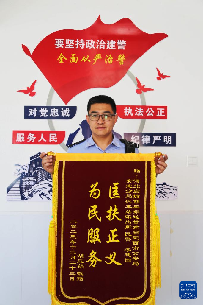 这是甘肃省定西市公安局安定分局汽车站派出所民警李建国和群众送给他的锦旗(8月27日摄)。新华社发(王克贤 摄)