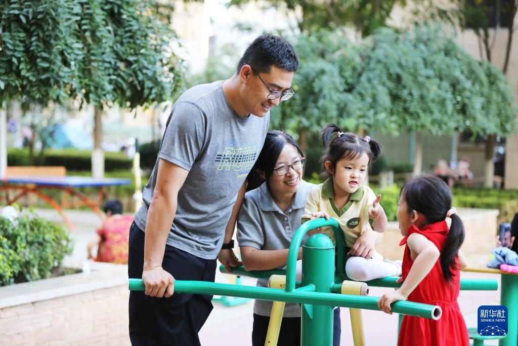8月26日,甘肃省定西市公安局安定分局汽车站派出所民警李建国(左)和家人在小区内玩耍。新华社发(王克贤 摄)