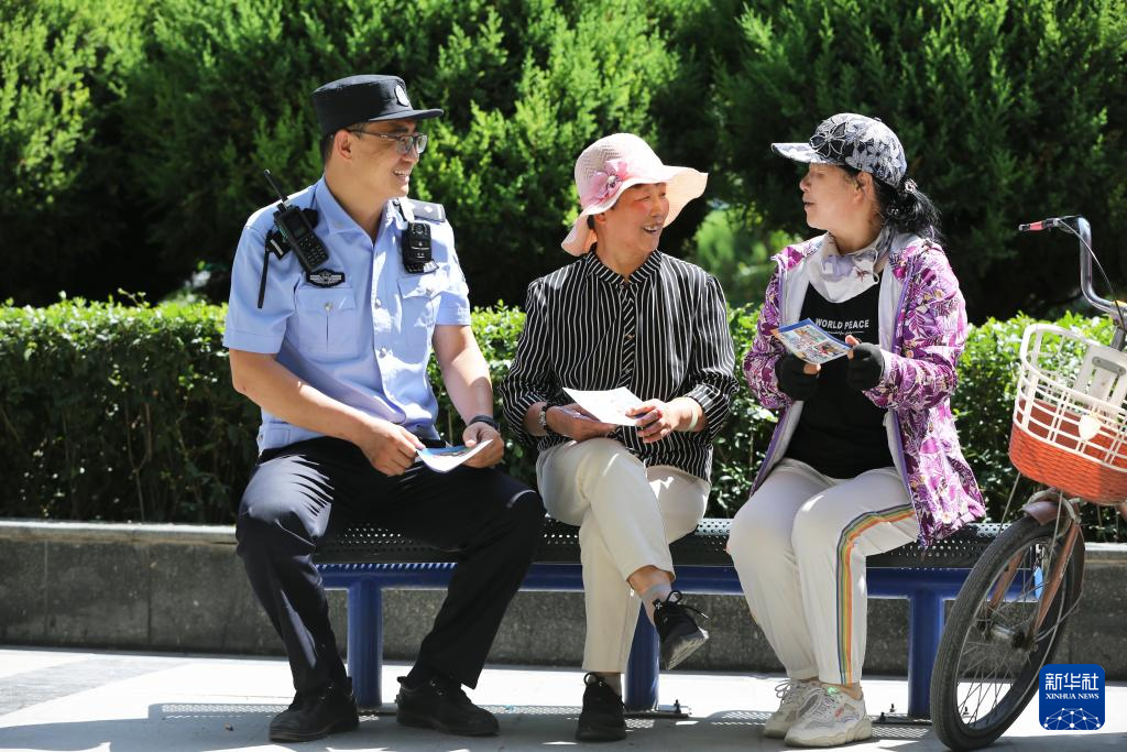 8月27日,甘肃省定西市公安局安定分局汽车站派出所民警李建国(左)在社区给老人讲授防诈骗技巧。新华社发(王克贤 摄)
