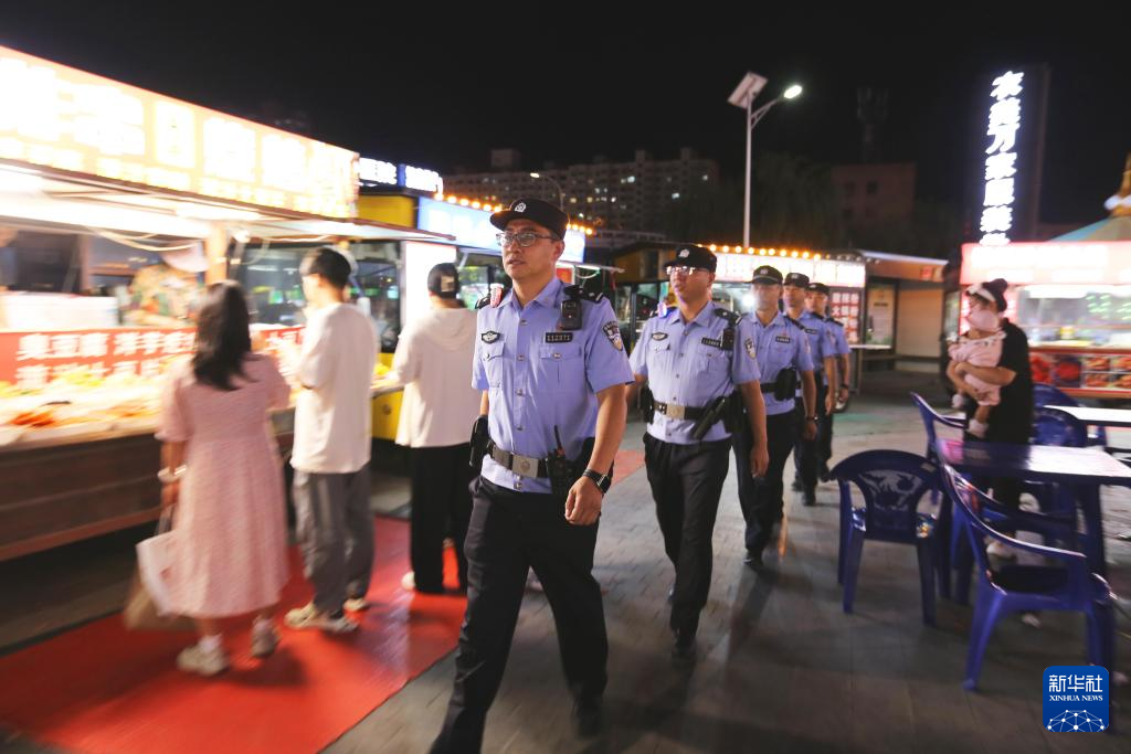 8月27日,甘肃省定西市公安局安定分局汽车站派出所民警李建国(前)和同事在闹市区巡逻。新华社发(王克贤 摄)