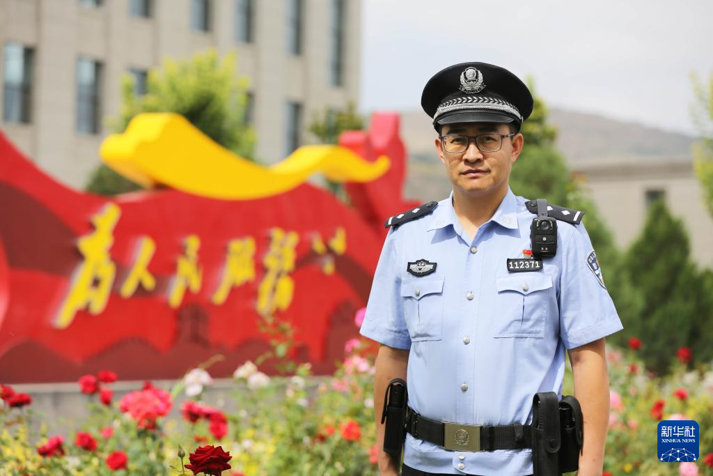 8月28日,李建国在甘肃省定西市公安局警务技能训练基地拍照留影。新华社发(王克贤 摄)