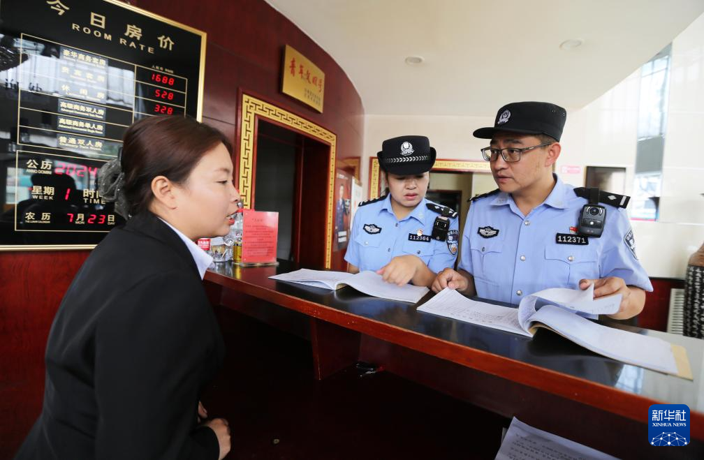 8月26日,甘肃省定西市公安局安定分局汽车站派出所民警李建国(右一)和同事在一家酒店查看信息登记。新华社发(王克贤 摄)