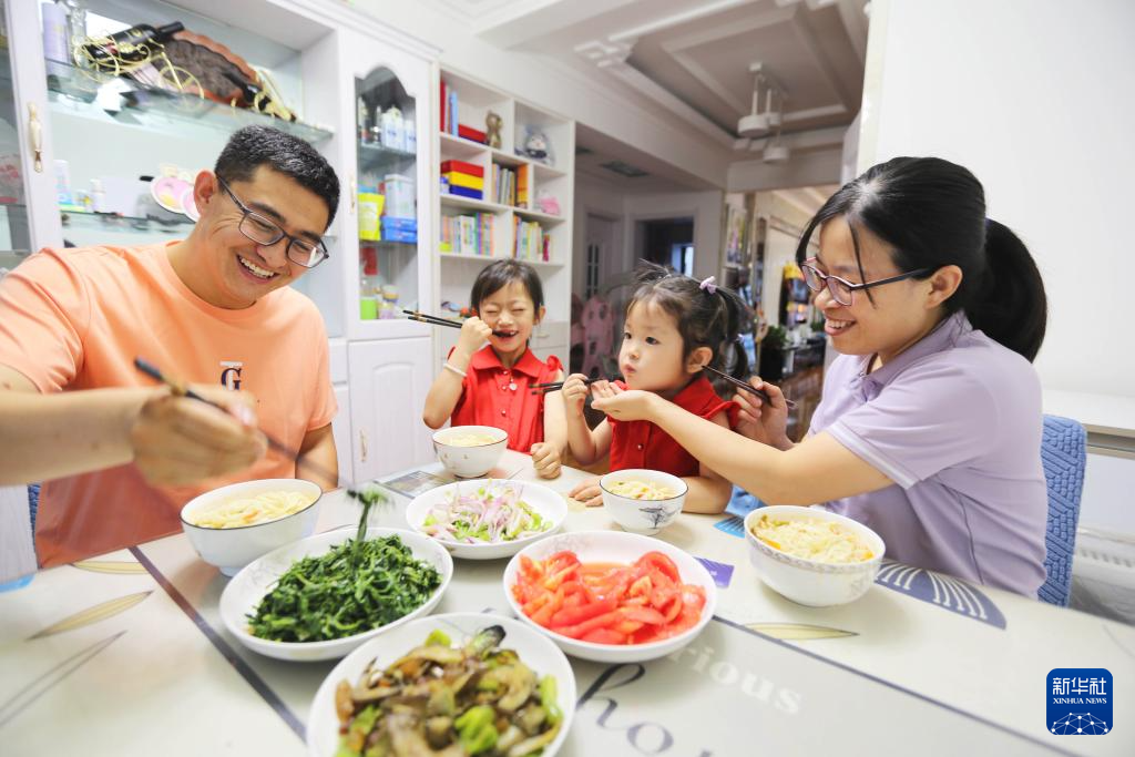 8月26日,甘肃省定西市公安局安定分局汽车站派出所民警李建国(左)和家人在家吃晚饭。新华社发(王克贤 摄)