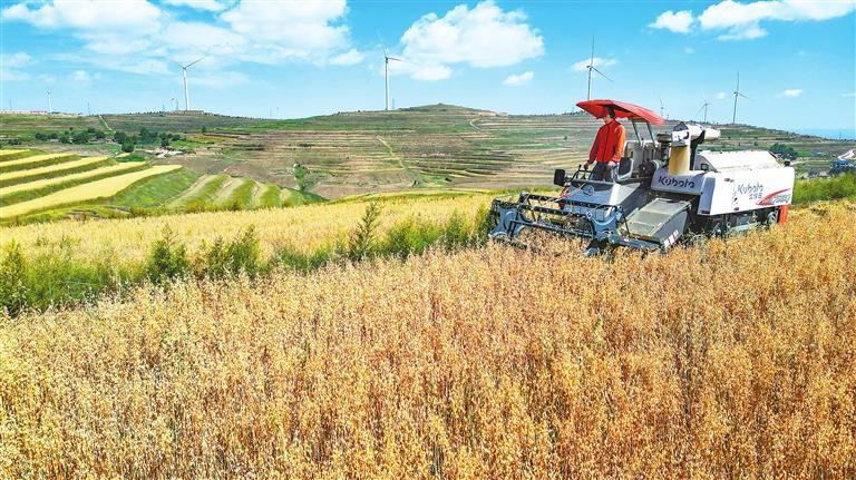 在通渭县华家岭镇的山梁上远眺,老站村、活马滩村燕麦连片种植区田间山地成片的燕麦长势喜人,微风拂过,掀起层层金色麦浪,一台台收割机正在田地里来回穿梭,收割燕麦。
