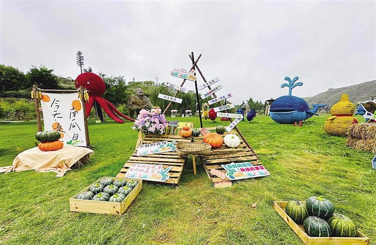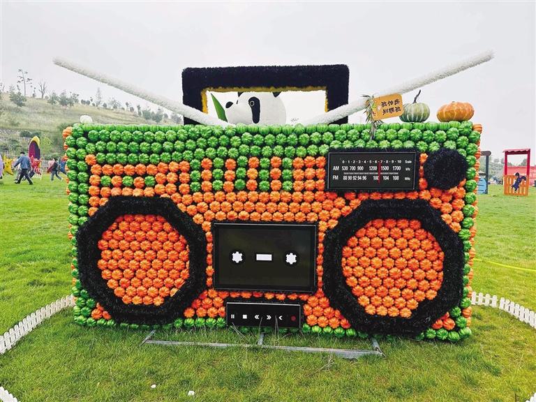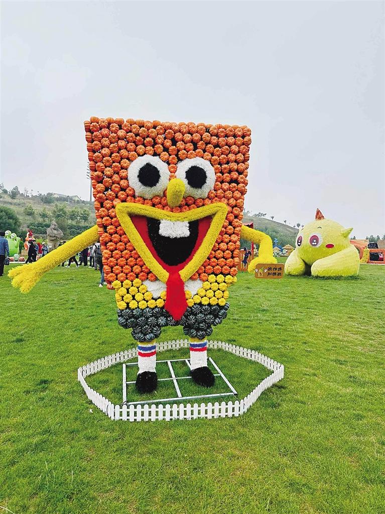 伴随着欢快的舞蹈,“丰收节”的开幕盛典正式开启。金黄的玉米、丰硕的果实与五彩斑斓的南瓜构成了一幅美丽的乡村画卷。南瓜艺术节以南瓜为主题,设置南瓜主题展区,展示各种形状、颜色各异的南瓜及南瓜艺术品。海绵宝宝、大象、松鼠和房子造型的南瓜作品,或高大奇特,或小巧玲珑,吸引众多游客拍照留念,感受南瓜的神奇与美丽。