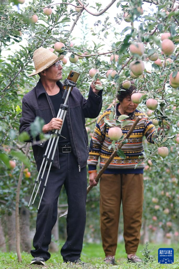 10月1日,礼县永兴镇龙槐村61岁的果农张加成(左)和妻子带着直播设备到苹果园干活。新华社记者 郎兵兵 摄