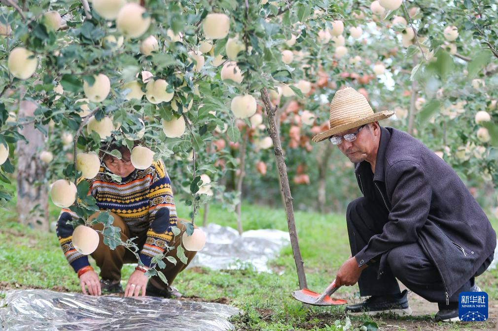 10月1日,礼县永兴镇龙槐村61岁的果农张加成(右)和妻子在苹果树下铺设反光膜。新华社记者 郎兵兵 摄
