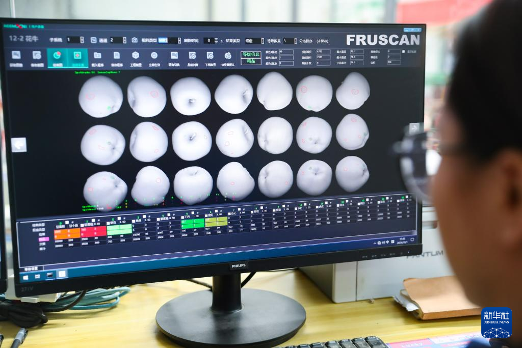 10月1日,礼县苹果产业发展集团有限责任公司工作人员通过红外光谱识别苹果内部品质。新华社记者 郎兵兵 摄