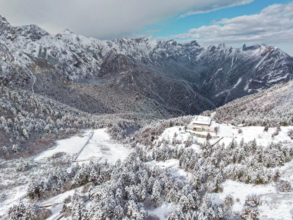 这是10月27日拍摄的官鹅沟森林公园雪景(无人机照片)。新华社发(刘辉 摄)