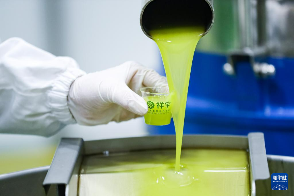 在陇南市武都区一家油橄榄加工企业,工作人员用小杯接取初榨橄榄油(10月31日摄)。新华社记者 郎兵兵 摄