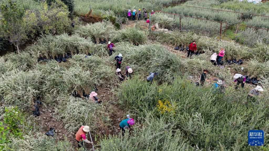 在陇南市武都区两水镇一处油橄榄育苗基地,村民在采挖油橄榄苗木(无人机照片,10月31日摄)。新华社记者 郎兵兵 摄