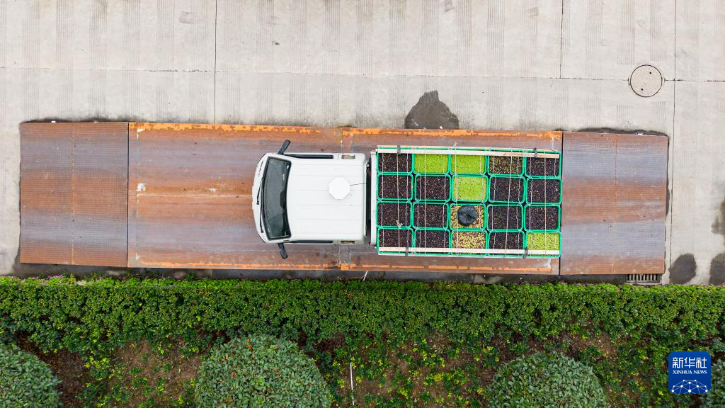 满载油橄榄鲜果的车辆驶入陇南市武都区一家油橄榄加工企业(无人机照片,10月31日摄)。新华社记者 郎兵兵 摄