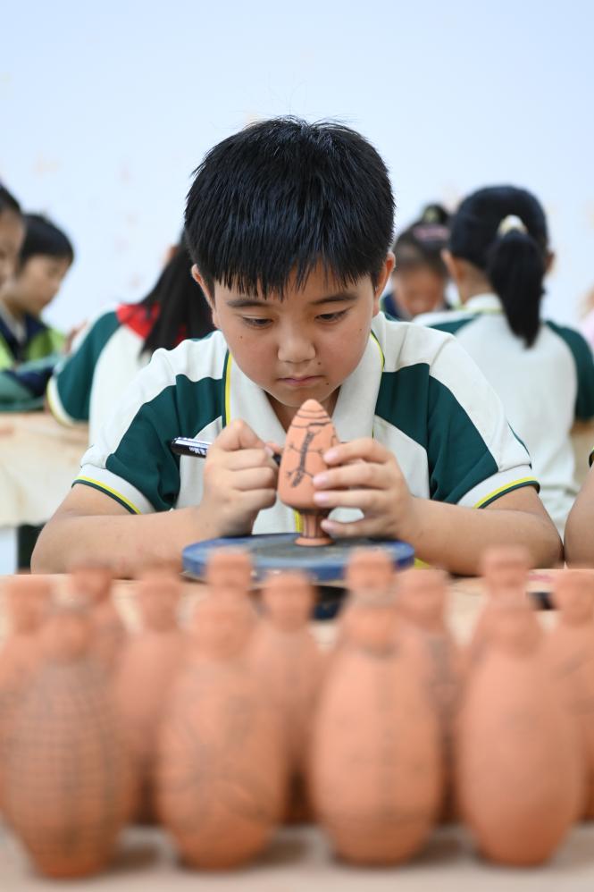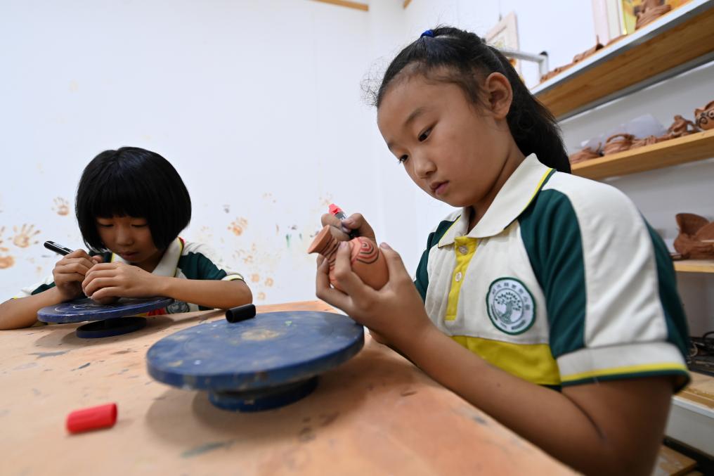 在临洮县第一实验小学,陶艺社团的学生制作陶坯。新华社记者 范培珅 摄