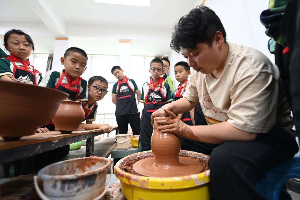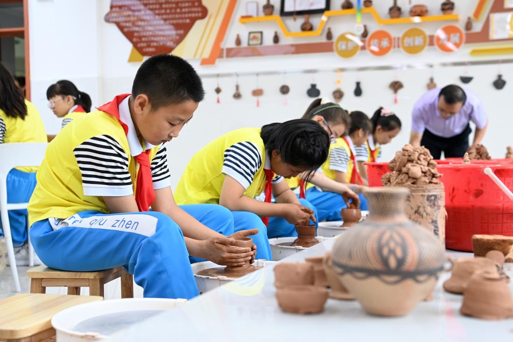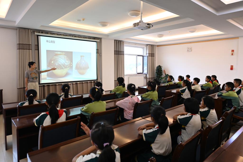 在临洮县马家窑彩陶文化小镇,老师为陶艺社团的学生讲解马家窑文化。新华社记者 范培珅 摄