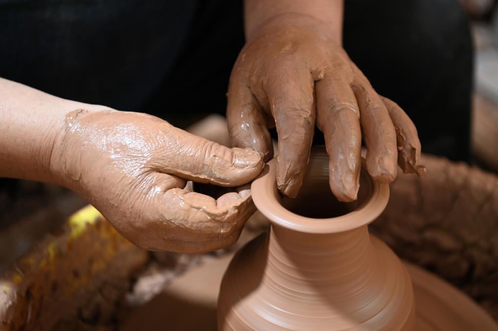 一双双手在旋转的陶坯上