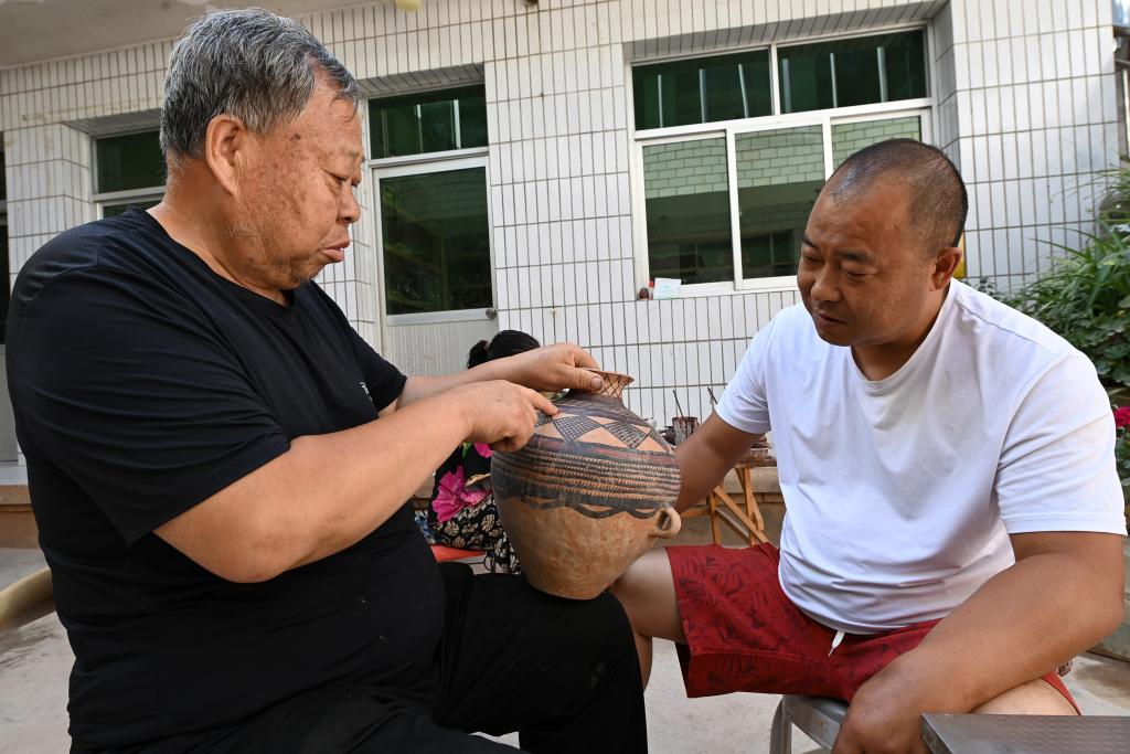 阎建林(左)在家中与儿子闫小虎探讨彩陶的线条。新华社记者 范培珅 摄